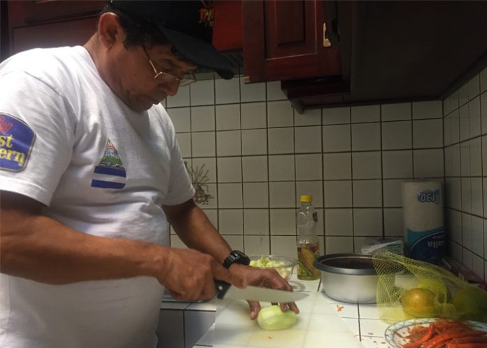 Obando procede a cortar cebollas, y tiene tanta experiencia con el cuchillo como su destreza en la guiar a Chocolatito en la esquina, sigue atento a los detalles y trata de no olvidar la ultima pisca de sal y ajo, Obando prepara dos tipos de comidas, una muy baja en calorías y la otra para el resto del equipo de trabajo, esta última es una carne molida con todos los ingredientes adecuados y el secreto del chef Obando. El otro día cociné una sopa de cabezas pescados, con otros ingredientes, Román comió una vez y después me pidió un poco más apunta Obando con cara de satisfacción.
