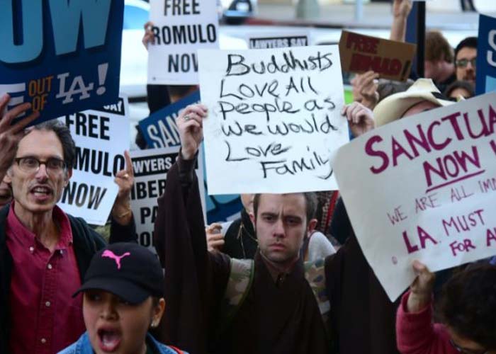 "¡Fuera ICE!", gritaban los manifestantes que llevaron pancartas con consignas como: "Santuario ahora, ICE fuera de LA", "No más deportaciones, punto" y "Musulmanes en solidaridad con Rómulo".
