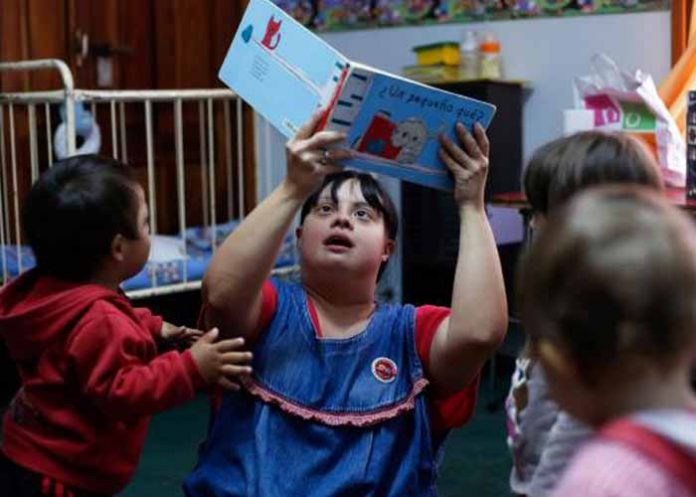 Con los ojos muy abiertos, los pequeños siguen el cuento que les narra Noelia Garella. Ninguno sabe que ante sí tiene a la primera persona con síndrome de Down que trabaja como maestra de preescolar en Argentina, y una de las pocas en el mundo.