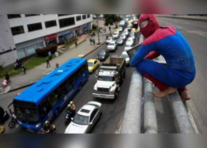 "Spiderman" abandonó Nueva York y ahora se pasea por el cielo de Bogotá, fijando la atención de los conductores que esperan el cambio del semáforo en una esquina del norte de la capital colombiana.