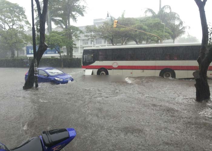 Uno de los puntos más afectados por la concentración de agua es Paseo Colón, donde se reporta que los vehículos tienen grandes dificultades para circular debido a que la carretera está convertida en un río.