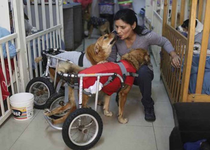 “A veces pienso que Dios me ha dado esta misión”, reflexiona la mujer de 48 años mientras cambia el pañal de “Pecas” uno de los ocho perros atropellados que ella rescató de una vida de sufrimiento y que ahora usan prótesis con ruedas para caminar.