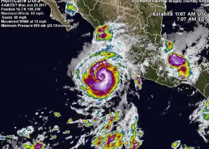 Se prevé que Dora se convirtiera, pasado el mediodía del lunes, en huracán categoría 1, cuando se ubique al suroeste de Manzanillo, en el occidental estado de Colima.