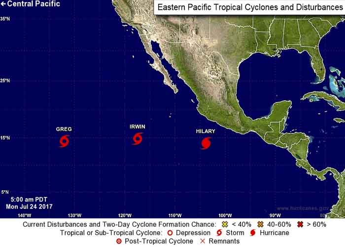 La tormenta tropical Greg se ubica ya a más de 2.000 kilómetros de costas mexicanas, sin que afecte el país, en tanto que Irwin sigue ganando fuerza y podría transformarse en huracán en las próximas horas, pero por su lejanía tampoco tendrá repercusiones en México.
