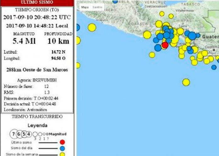 El epicentro del sismo se ubicó a 288 kilómetros, con una profundidad de 10 kilómetros al oeste del departamento suroccidental de San Marcos.
