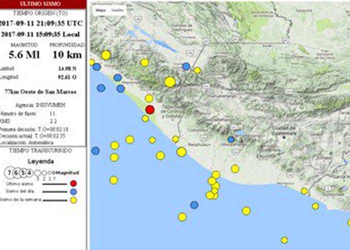 Guatemala, 11 sep (EFE).- Un sismo de magnitud 5,6 en la escala abierta de Richter sacudió hoy regiones del suroeste de Guatemala sin causar víctimas ni daños, informó una fuente oficial.