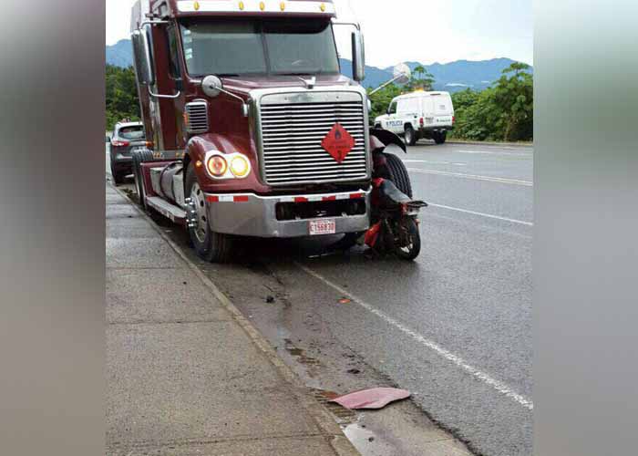 “Se desplaza una unidad al lugar, al llegar encontramos una motocicleta que colisiona con un vehículo de carga pesada y un masculino fallecido en la escena. El chofer del vehículo pesado está bastante nervioso, él iba de Palmar Norte a Puntarenas, mientras que el ocupante de la moto se dirigía a Quepos centro”, explicó Fraiser Castillo, del Cuerpo de Bomberos.