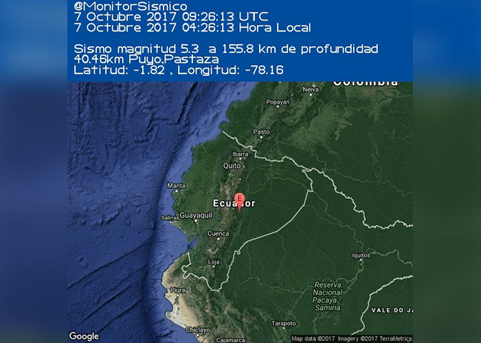 Según el Instituto Geofísico, el seísmo ocurrió a las 04:26 hora local (09:26 GMT) a 1,83 grados de latitud sur y a 78,21 grados de longitud oeste.