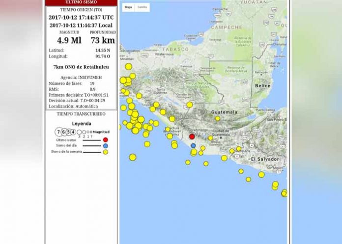 Autoridades informan sobre un sismo de magnitud 4.9, con epicentro a 7 kilómetros al Oeste-Noroeste de Retalhuleu. Se monitorea sensibilidad.