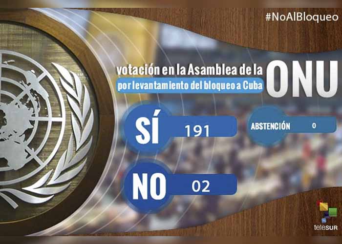 Con un total de 191 votos a favor, las delegaciones que integran la Asamblea votaron por el proyecto de resolución titulado "Necesidad de poner fin al bloqueo económico comercial y financiero impuesto por los Estados Unidos de América contra Cuba".