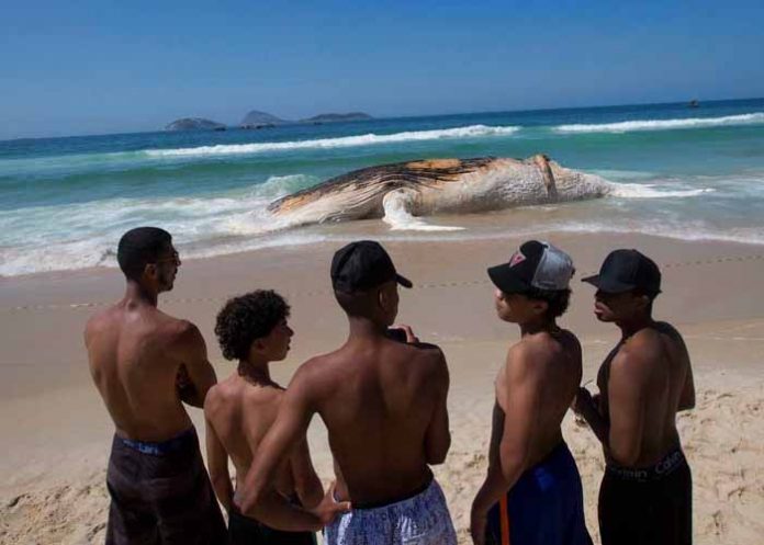 #AméricaLatina | Un grupo de personas observa una ballena?? de entre 13 y 15 metros que apareció muerta, frente a la turística playa?? de #Ipanema de #RíoDeJaneiro #Brasil ??@canaltn8 pic.twitter.com/eyxGFPlSBt