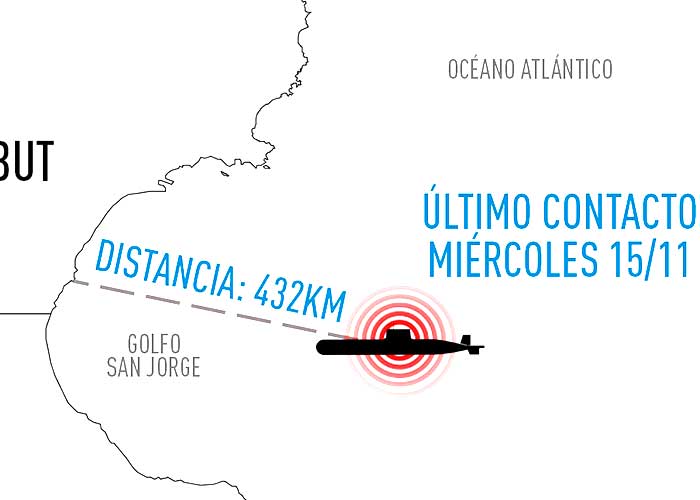 La última señal del sumergible fue registrada a la altura del golfo San Jorge, en aguas argentinas del océano Atlántico, a 432 kilómetros de la costa de la provincia de Chubut.