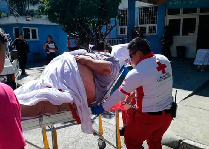 Seis hombres tuvieron que unir fuerzas para cargar a Aparicio y subirlo a la camilla, el hombre fue asistido con oxígeno y trasladado al Hospital Roosevelt, donde también tuvieron que ayudar para ingresarlo a la emergencia.