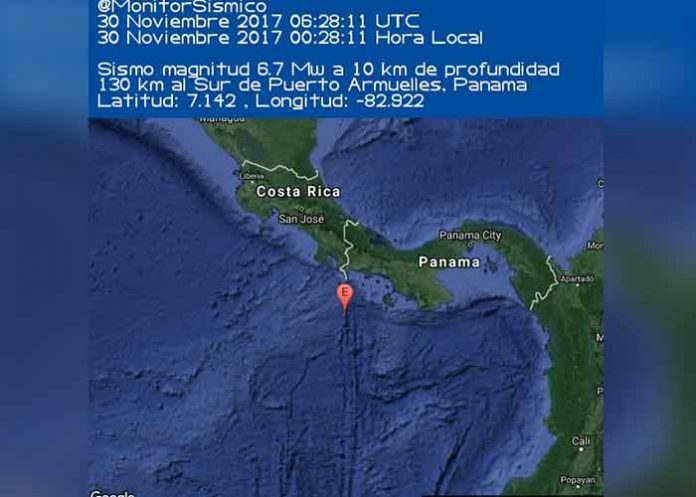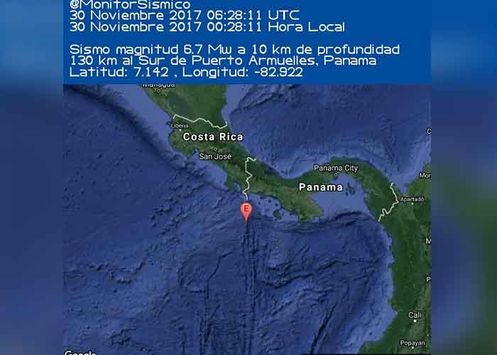 El movimiento fue registrado el 30-11-2017 a las 06:28 de la mañana, con epicentro 130 km al Sur de Puerto Armuelles, Panamá. Tenía una magnitud de 6.7 Mw a una profundidad de 10 Kilómetros.