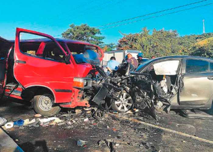 Dos hombres murieron y siete personas resultaron lesionadas en un accidente de tránsito entre un vehículo particular y un microbús, ocurrido ayer a las 5 de la mañana en el kilómetro 62 de la carretera Panamericana, en las inmediaciones del caserío El Carrizo, cantón San Juan de Merino, en Apastepeque, San Vicente.