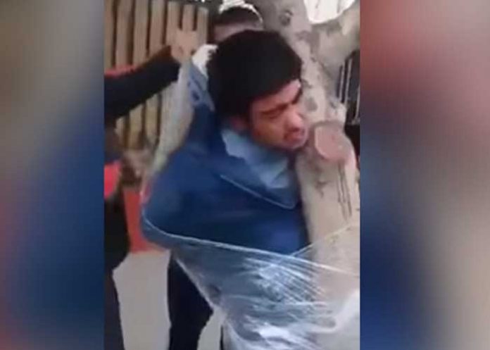 Seguidamente, los vecinos envolvieron al malhechor contra un árbol utilizando un rollo de plástico para embalaje.