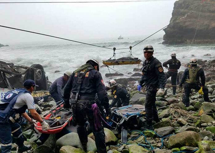 El bus de la empresa de transporte interprovincial "San Martín" cayó a un acantilado el martes desde un estrecho tramo de la vía conocido como "Curva del Diablo" tras chocar con un camión de carga a unos 70 kilómetros al norte de Lima. La zona tiene 52 curvas en 22 kilómetros y apenas cuenta con un muro de 50 centímetros de altura para contener caídas al abismo.