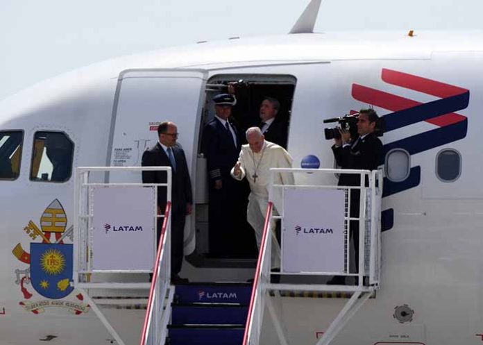 El avión Airbus 321 de la compañía Latam que transporta al pontífice y su séquito arribó al aeropuerto internacional Jorge Chávez, de Lima, a las 16.32 hora local (21.32 GMT), procedente de la ciudad de Iquique, en Chile, país que visitó en la primera parte de su sexta gira pontificia por Latinoamericana.