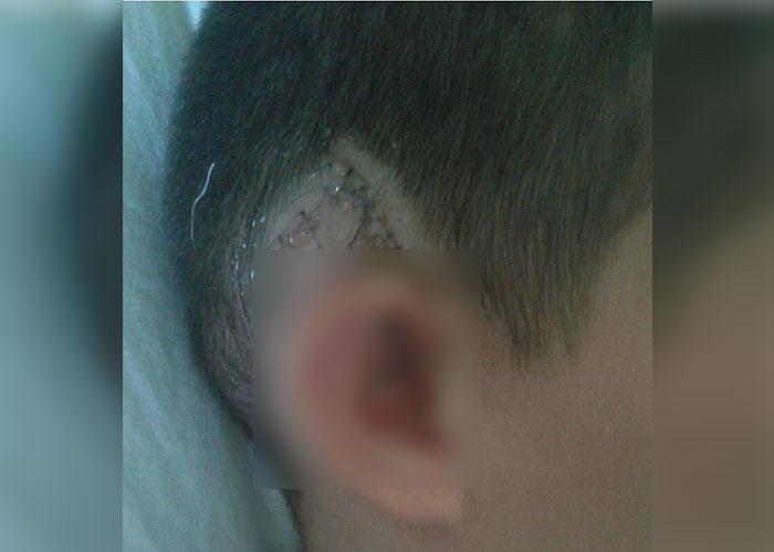 La señora explicó que en ese momento el compañerito lo empujó sin medir la fuerza, con tan mala suerte que el niño afectado pegó contra el filo de una puerta de metal, que fue la que provocó la enorme herida en su oreja.