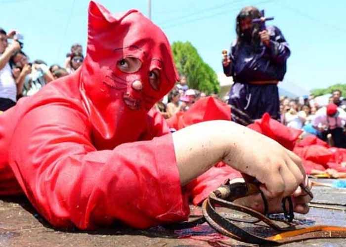 Con la rabia de la derrota, cada "endiablado" corre por las calles mientras ondea su latigo y reparte crueles golpes a los asistentes, quienes corren a un lugar donde los azotes no los alcancen o los aceptan resignados, con el objetivo de purgar sus pecados. La tradición dice que por cada latigazo recibido, se limpia una culpa.