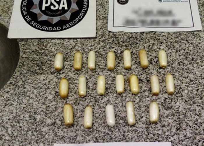 Un hombre que llevaba más de 400 gramos de cocaína en 54 cápsulas que había ingerido, fue detenido en el Aeropuerto Internacional de Ezeiza cuando intentaba abordar un vuelo hacia la provincia de Tierra del Fuego, informaron hoy fuentes de la Policía de Seguridad Aeroportuaria (PSA).