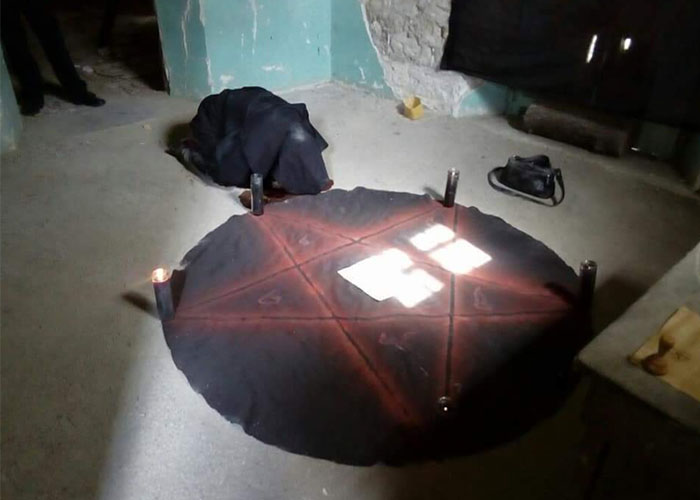 En la primera planta del edificio se pueden observar restos de objetos utilizados para la realización de ritos satánicos, entre ellos cruces invertidas de madera y muchos símbolos pintados en las paredes.