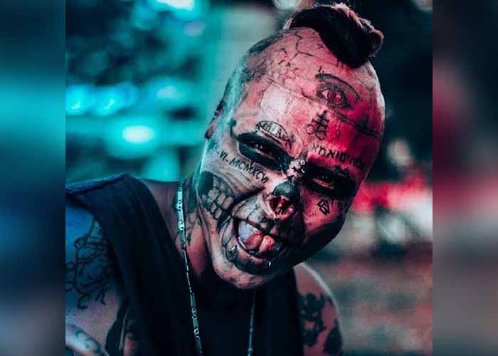 El colombiano decidió partirse la lengua por la mitad y se tatuó un color azul grisáceo, tiene muchos tatuajes en el rostro incluido unas cuencas negras que simulan los orificios de los ojos.