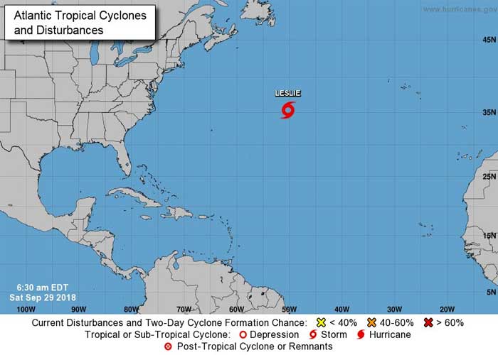 #30Sep 8am #Leslie desde ayer paso de tormenta subtropical a tropical. Se mantiene a unos 1100Km al ENE de Bermudas con vientos de 85Kmh pic.twitter.com/VrjgAkSTFN