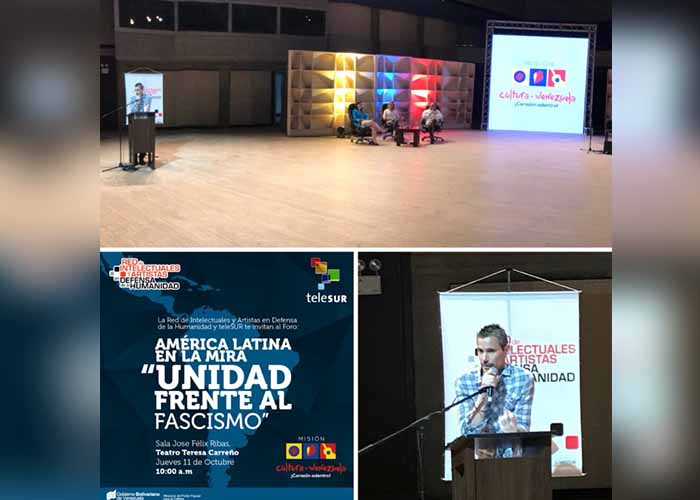 La Red de Intelectuales y Artistas en Defensa de la Humanidad en conjunto con TeleSUR y la Misión Cultura Corazón Adentro invitan a la población venezolana a participar este jueves 11 de octubre en el foro "América Latina en la mira: unidad contra el fascismo", en la sala José Félix Ribas del Teatro Teresa Carreño, en Caracas.
