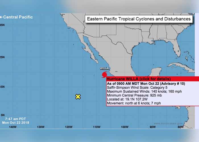 Asimismo pronosticó que Willa se convertiría en un huracán de categoría 5 el lunes por la tarde, generando condiciones de marea peligrosas.