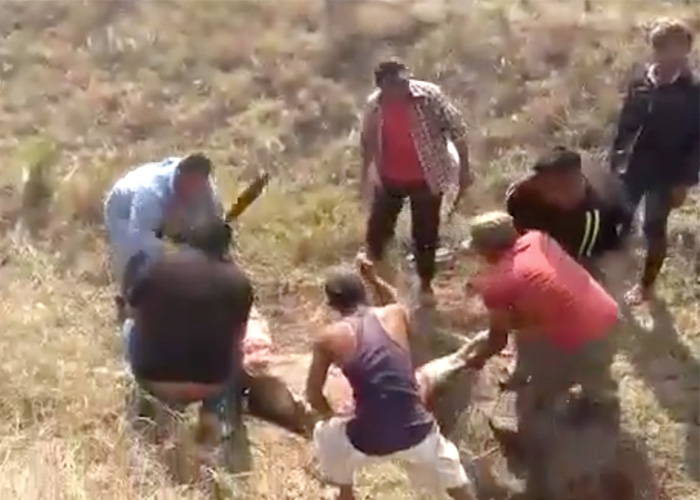 En las imágenes se observa a seis hombres golpear y cortar a un animal con lo que parecen ser palos y cuchillos.