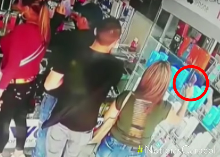 En un video grabado por cámaras de seguridad en una tienda de celulares en Mosquera, departamento de Cundinamarca, Colombia, quedó grabada la astucia de una mujer para robar móviles.