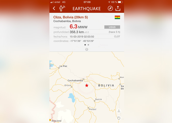 Se registra un terremoto de magnitud 6,3 en Cochabamba, Bolivia.El servicio geológico de EE.UU. (USGS) reporta que el sismo se produjo a 28 kilómetros de Cliza.