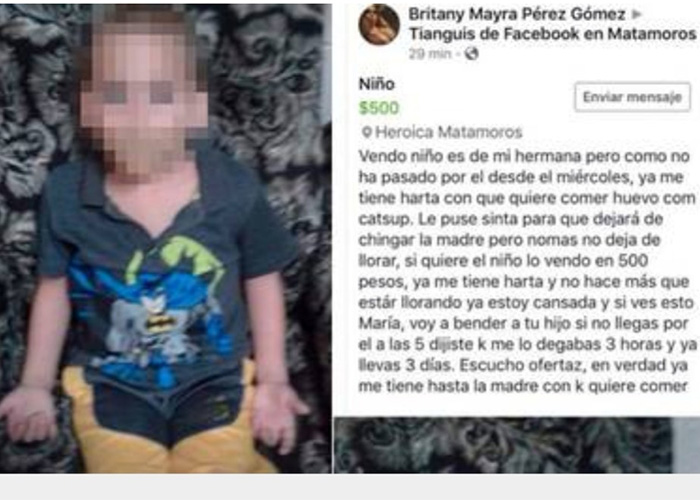 Una mujer del estado mexicano de Tamaulipas puso en venta a su sobrino a través de Facebook, cansada del abandono de la madre del menor, que lo dejó tres horas a su cuidado, pero que no apareció en las últimas 72 horas.