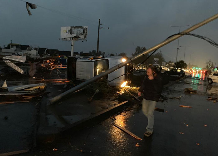 Autos volcados, casas sin techo y postes caídos deja a su paso un enorme tornado en la región Bíobío, específicamente en Los Ángeles, al sur de Chile.