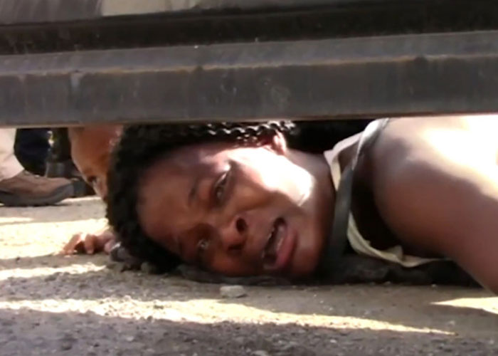 La migrante intenta ser escuchada por debajo del portón del establecimiento y suplica ayuda frente a las cámaras.