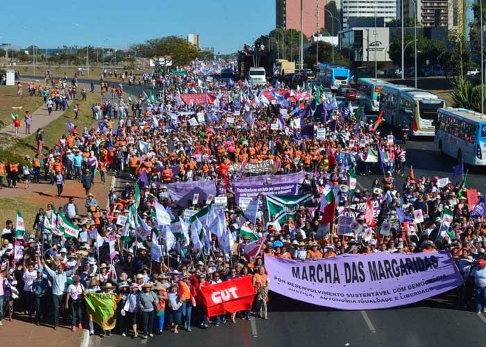 Marcha de las Margaritas en Brasilia. Miles de mujeres movilizadas a favor de la tierra, el agua, el bosque, la producción agroecológia, la sostenibilidad alimentaria y el medio ambiente, y contra la Reforma Jubilatoria. @ConexiontlSUR pic.twitter.com/p7JEI21Pzc