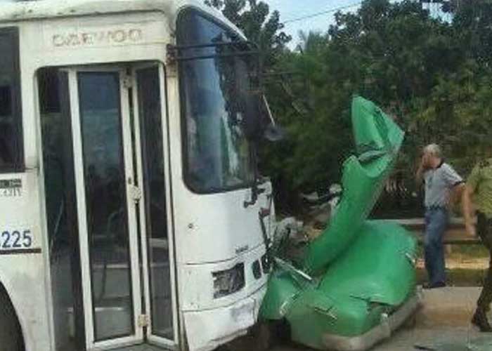 En la imagen que acompaña la nota publicada en la web Cubadebate se ve cómo el auto antiguo, conocido en el país como "almendrón", quedó casi completamente destruido y empotrado contra el autobús.