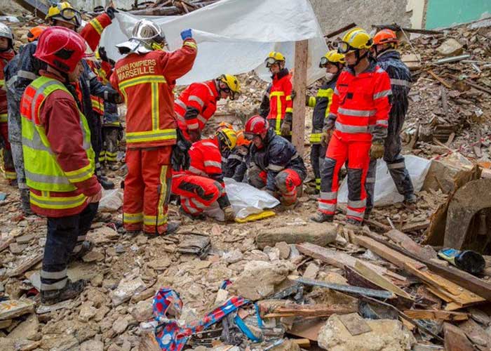 Los bomberos han establecido un perímetro de seguridad y han intensificado las búsquedas de posibles víctimas con la ayuda de perros.