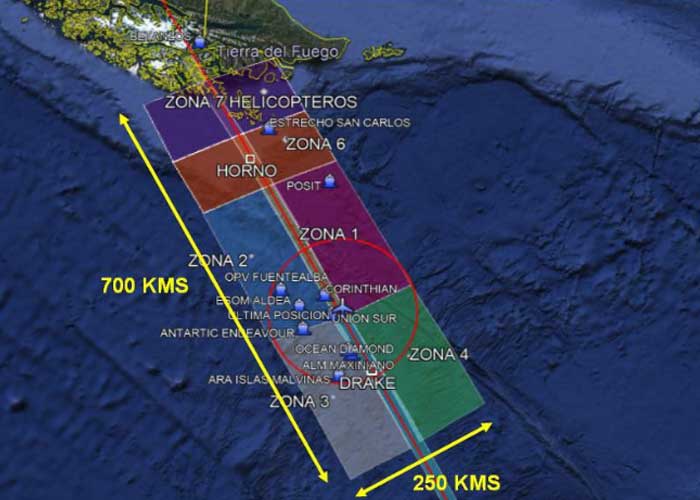 La búsqueda se ha dividido en dos áreas, una que rastrea todo aquello que se encuentran flotando en el mar en un radio de 80 kilómetros y una segunda que busca en las profundidades del Mar de Drake, que separa Suramérica del continente helado y cuyas aguas están consideradas unas de las más turbulentas del planeta.