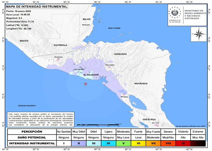 DATOS FINALES: Sismo mag. 5.3, frente a la costa de Usulután. A 37 km al sur de Península San Juan del Gozo. Prof. 71 km. [2020-01-10, 10:00] pic.twitter.com/dtwchQOx0B