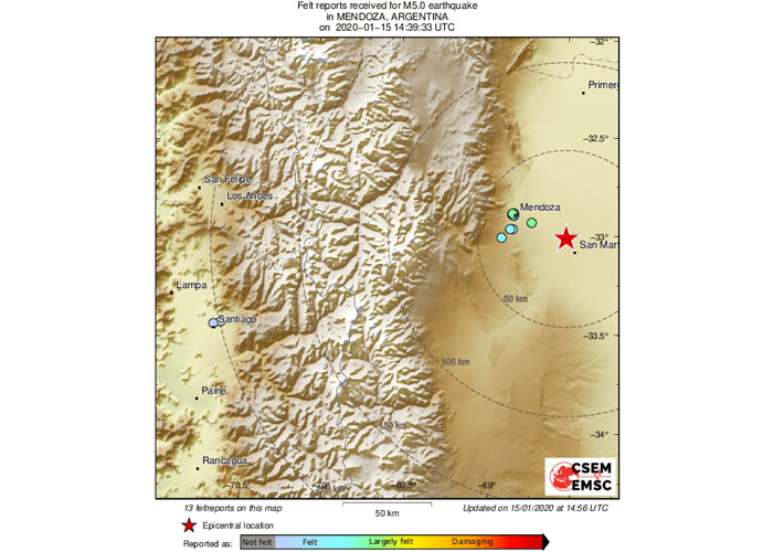 Según el Instituto Nacional de Prevención Sísmica (Inpres), el epicentro se ubicó 12 km al noroeste de San Martín, una de las ciudades más importantes de la provincia de Mendoza, con una profundidad de 15 km.