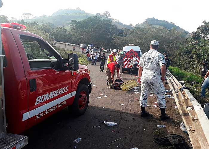 Un migrante fallecido y 81 lesionados en accidente carretero ocurrido cerca de San Andrés Tuxtla, Veracruz.