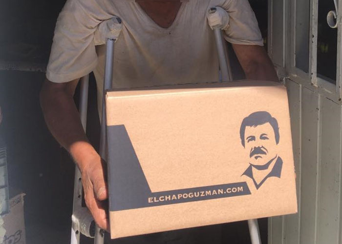 Las despensas son entregadas en cajas de cartón que tiene la imagen del narcotraficante sinaloense recluido en una cárcel de máxima seguridad de Estados Unidos y tiene impresa la leyenda de la página web elchapoguzman.com.