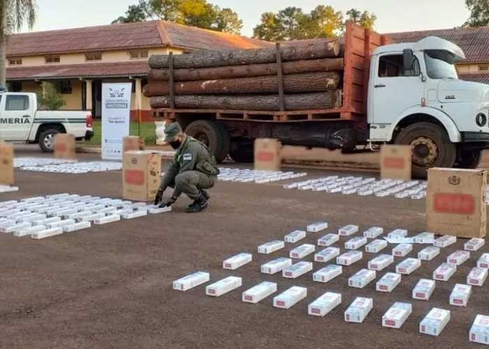 Al ingresar al vehículo de gran tamaño, comenzaron a ver troncos de pinos. Todo parecía normal hasta que advirtieron la presencia de unas cajas. Al abrirlas, dieron cuenta de una gran cantidad de paquetes de cigarillos ilegales.
