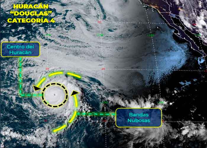 "Douglas se intensifica a huracán categoría 4 en la escala Saffir-Simpson, su centro se ubica al oeste-suroeste de Baja California Sur, muy lejos de costas mexicanas", apuntó el SMN en su más reciente informe.