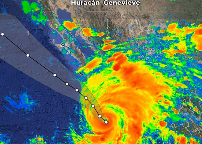 Genevieve, que llegó a tener fuerza de huracán de categoría 4, tenía vientos máximos sostenidos de 140 kilómetros por hora (85 millas por hora) el miércoles por la tarde, informó el NHC. Se ubicaba a 140 kilómetros (85 millas) al sur de la punta de la Península de Baja California. Se movía al nor-noroeste a 13 km/h (8 mph).