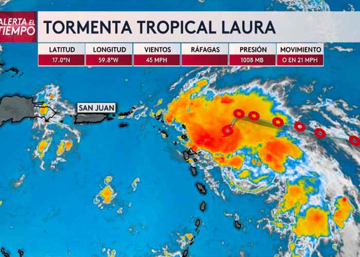 A las 9:05 a.m., la tormenta Laura 13 se encontraba en la latitud 17.0 grados norte y la longitud 59.8 grados oeste. Se movía a 21 millas por hora al oeste, con vientos sostenidos de 45 millas por hora y una presión de 1,008 milibares, informó el Centro Nacional de Huracanes.