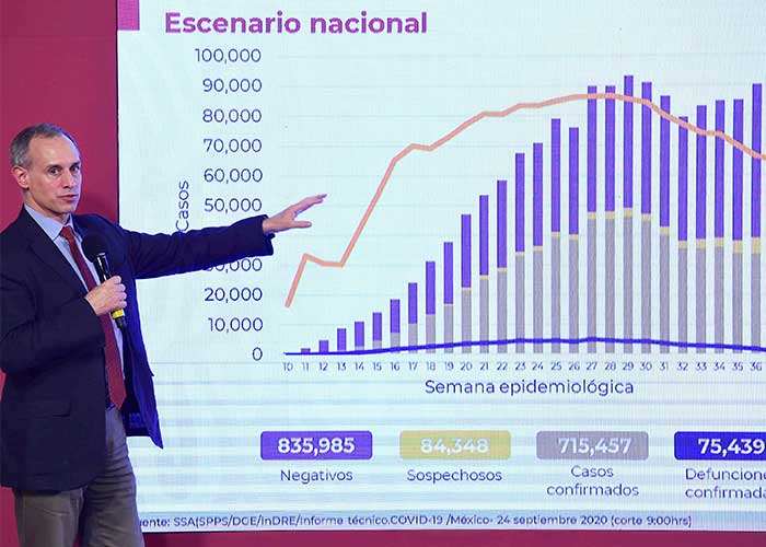 López-Gatell comentó que, si se considera la suma de los casos confirmados más los sospechosos que se esperan resulten positivos, se pueden estimar 749.736 contagios acumulados y con el mismo principio en 77.155 los decesos.