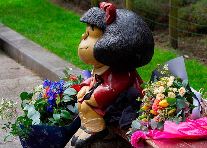 "Con Mafalda aprendí a leer", dice Maru, una joven veinteañera que llega en bicicleta y, protegida con cubrebocas, se acerca a dejar un ramo de fresias amarillas en la banca que, al mediodía, ya está rodeada por fotógrafos y camárografos de medios argentinos y extranjeros.
